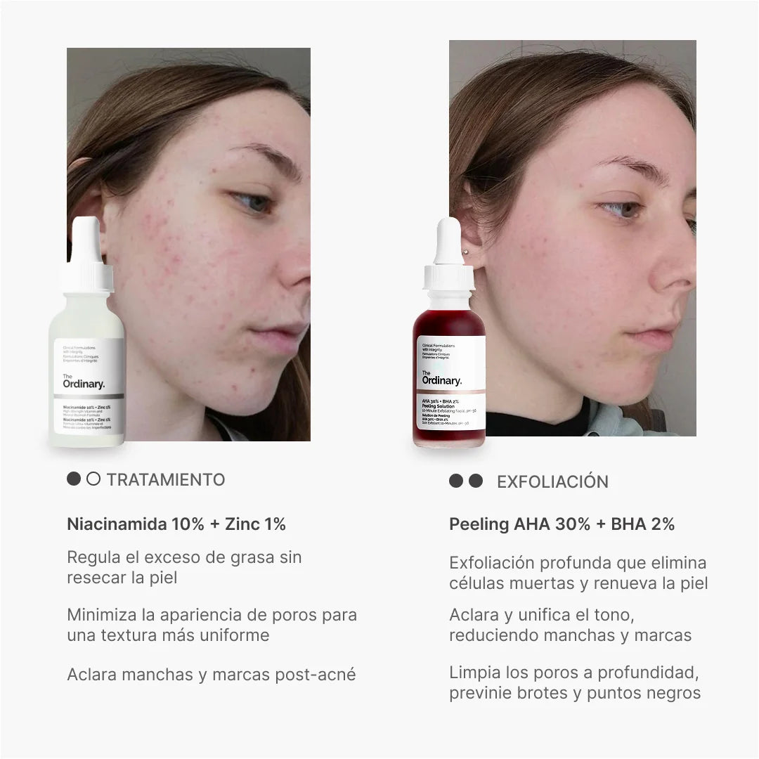 El kit combina ingredientes como Niacinamida y Peeling Solution para limpiar profundamente, controlar brotes, desinflamar granitos y mantener la piel libre de impurezas.