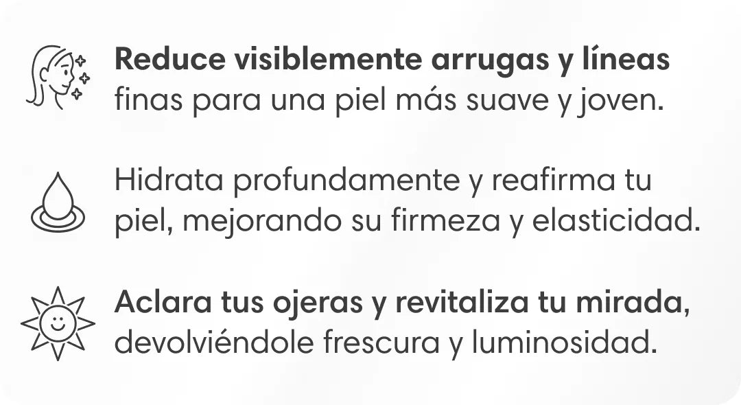 Esta crema está hecha para usarse todos los días, incluso en pieles sensibles. Mientras la aplicás, sus ingredientes empiezan a activar tu piel desde adentro, dándote un sensacional de firmeza y frescura incluso luego de unos minutos. Sin ardor, sin esperar meses, solo una mirada más despierta con cada uso.